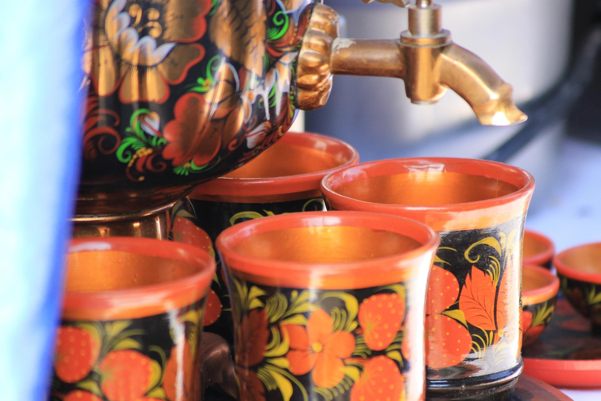 Wer möchte, kann vorab ein reichhaltiges „Zarenfestmahl“ bestellen mit allen Köstlichkeiten, die die russische Küche zu bieten hat: natürlich Sakuski, die russische Variante der spanischen Tapas, Suppen wie Borschtsch-Ukrainskij und Soljanka, Teigwaren wie Pelmeni, Wareniki und Piroschki und natürlich russische Blinis, die an französische Crêpes erinnern, und zusammen mit Smetana, saurer Sahne, zum Kaviar gereicht werden. Als Hauptgang gibt es Schaschlik, Lachsfilet oder geschmortes Rindfleisch mit Backpflaumen und zum Dessert süß gefüllte Blinis.